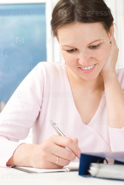 Улыбающаяся молодая женщина сидит за столом и пишет на бумаге
