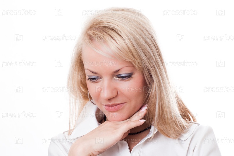 Размышляющая молодая женщина, белый фон