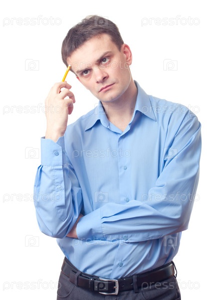 Задумчивый бизнесмен на белом фоне