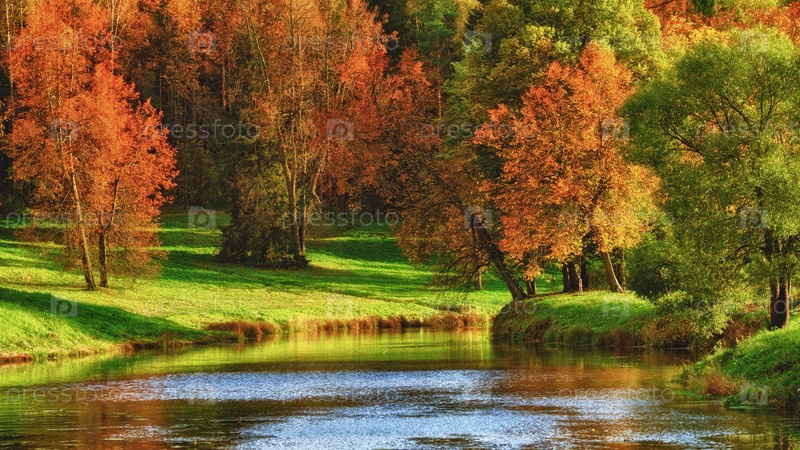Осенний пейзаж с озером и пожелтевшими деревьями