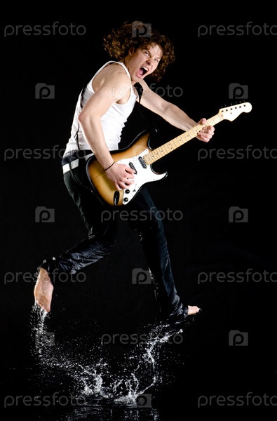 Портрет динамичного исполнителя с электрической гитарой, прыгающей и брызгущей водой