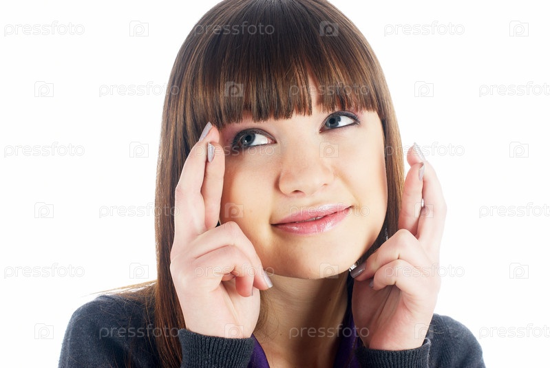 Портрет молодой девушки, скрестившей пальцы, изолированный на белом фоне