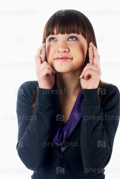 Портрет молодой девушки, скрестившей пальцы, изолированный на белом фоне