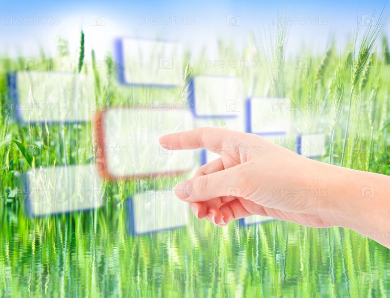 Рука нажимает на сенсорную кнопку на фоне зеленого поля