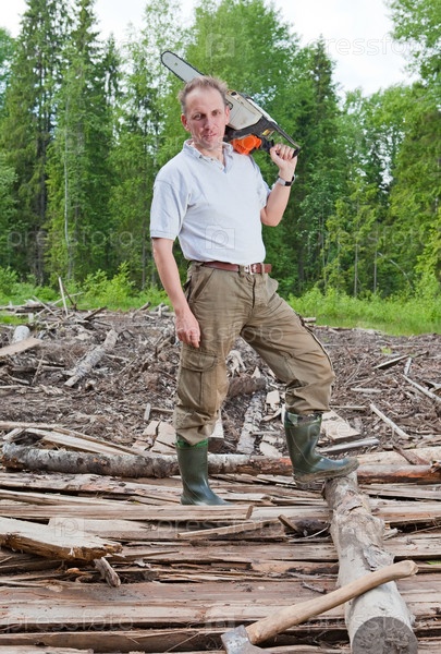 Человек в лесу с электропилой