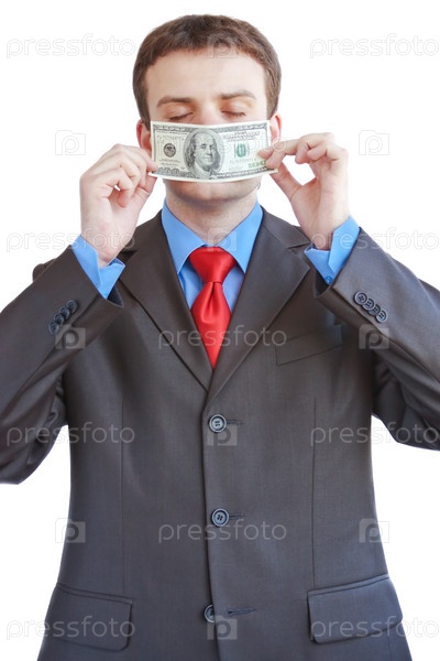 Молодой бизнесмен со стодолларовой купюрой на белом фоне