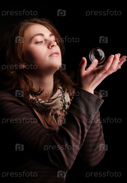 Женщина и мыльный пузырь на черном фоне