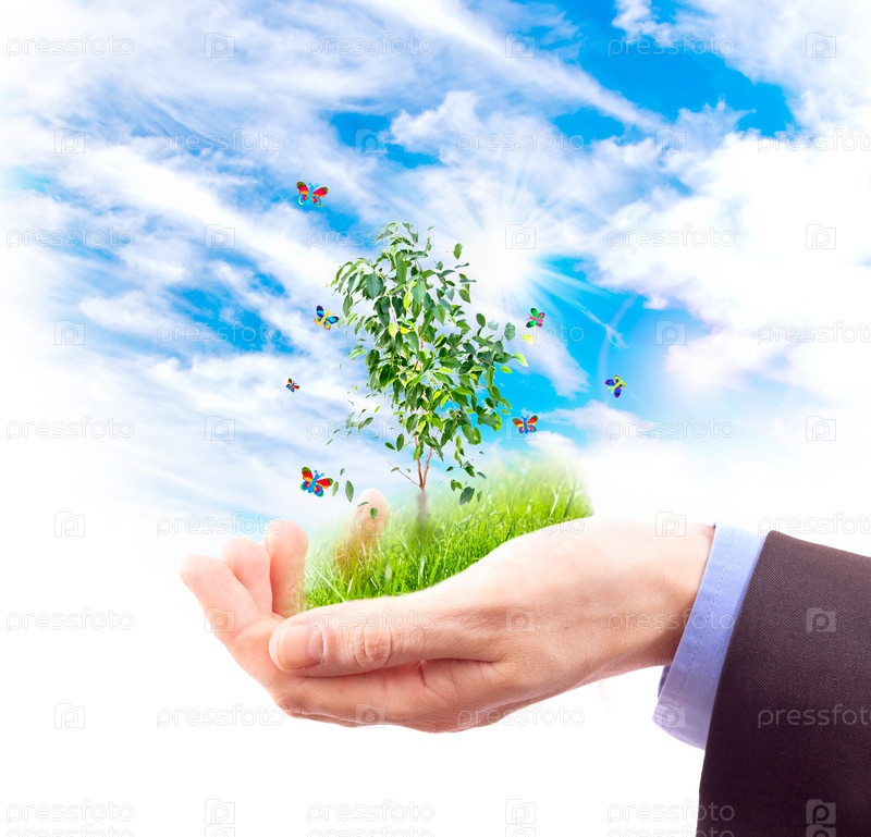 Трава, дерево и летающие бабочки в мужской руке