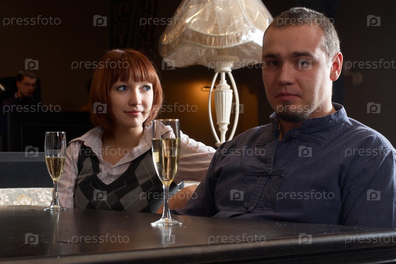 Девушка и парень сидят в баре с бокалами шампанского