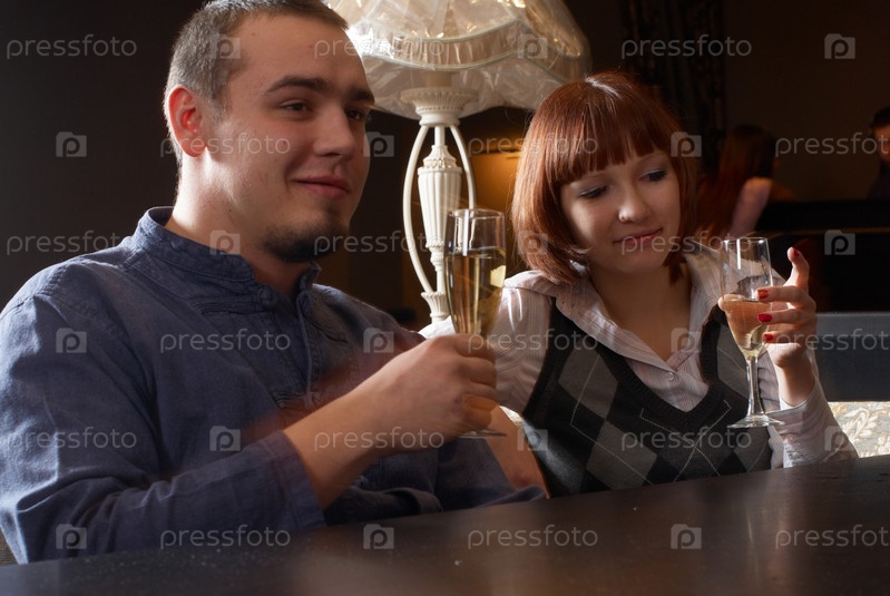 Девушка и парень сидят в баре с бокалами шампанского