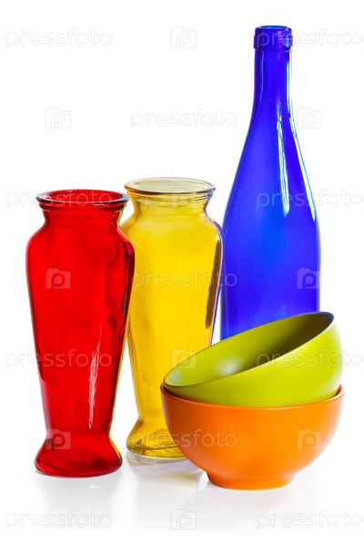 Цветные керамические чашки, стеклянная бутылка и вазы на белом фоне