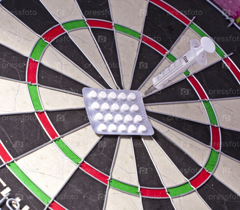 Таблетки приколоты шприцем к мишени для игры в дартс