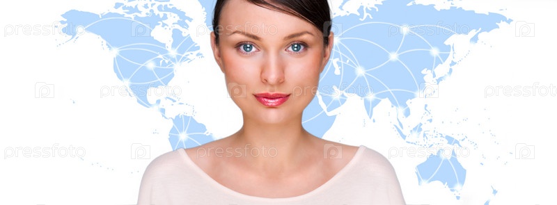 Портрет молодой красивой девушки, на фоне карты мира