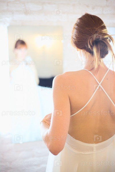 Красивая молодая женщина, примеряющая свадебное платье перед зеркалом