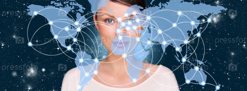 Портрет молодой красивой девушки, с виртуальной картой мира на переднем плане