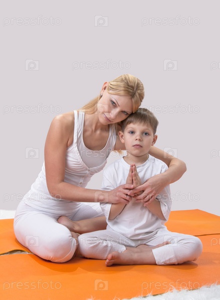 Красивая молодая мать практикует йогу с сыном