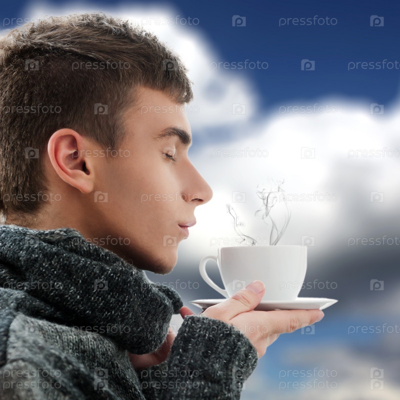 Портрет молодого человека с белой кружкой, на фоне неба