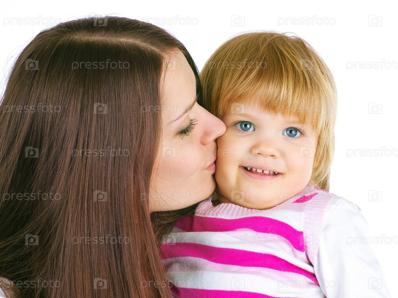 Портрет красивой молодой женщины и ее дочери на белом фоне