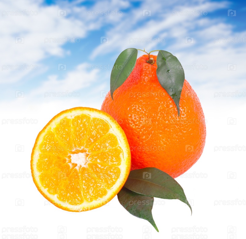 Свежие апельсины на фоне неба