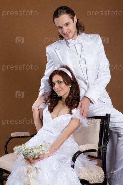 Молодая женщина и мужчина в свадебной одежде