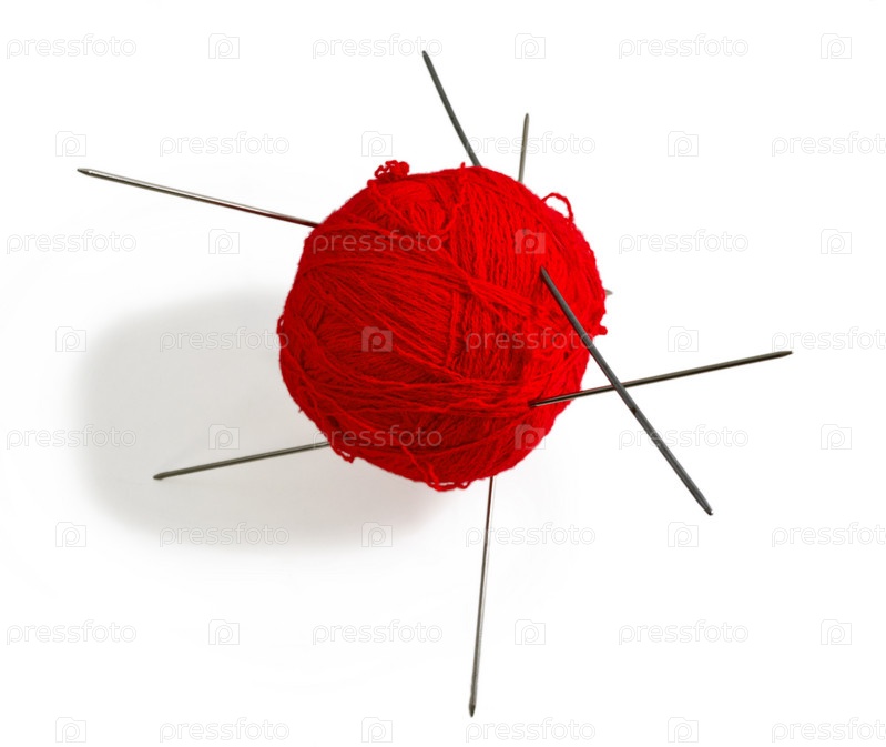 Клубок красной пряжи и спицы на белом фоне