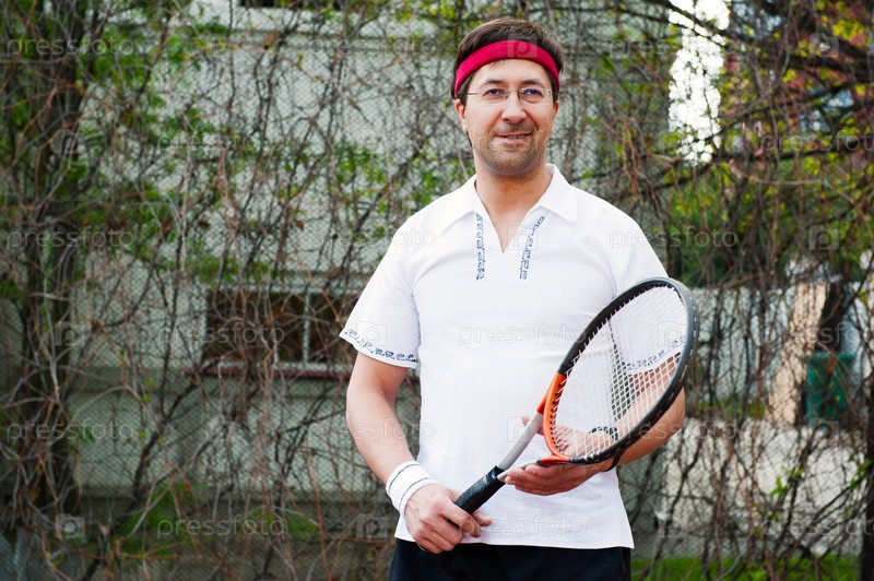 Взрослый мужчина с ракеткой на фоне своего дома