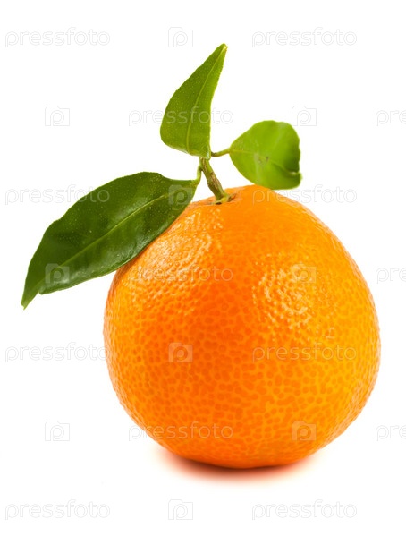 Спелый апельсин с зелеными листьями на белом фоне