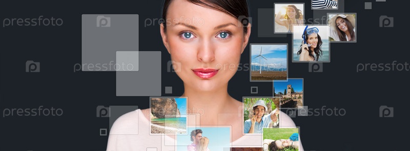 Девушка с фотографиями в виртуальном пространстве на сером фоне