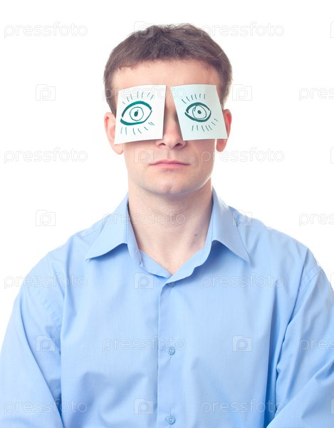 Бизнесмен с наклейками глаз на лице на белом фоне