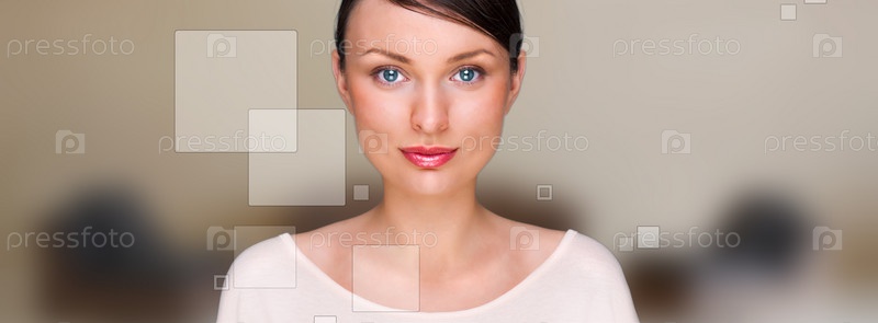 Девушка в виртуальном пространстве на сером фоне