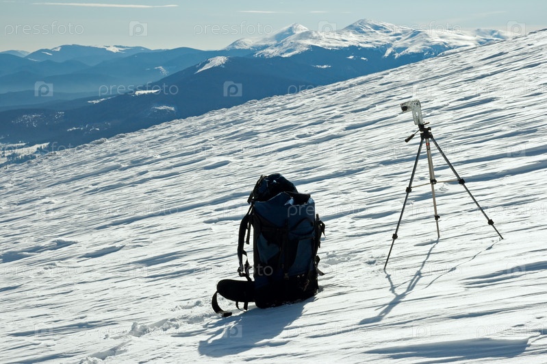 Зимний горный пейзаж с туристическим рюкзаком и штативом
