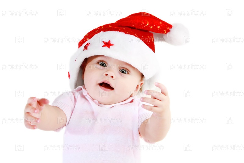 Малыш в новогодней шапке, изолировано на белом фоне