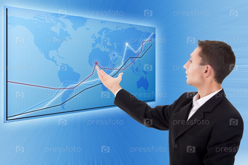 Портрет молодого бизнесмена, указывающего на графики