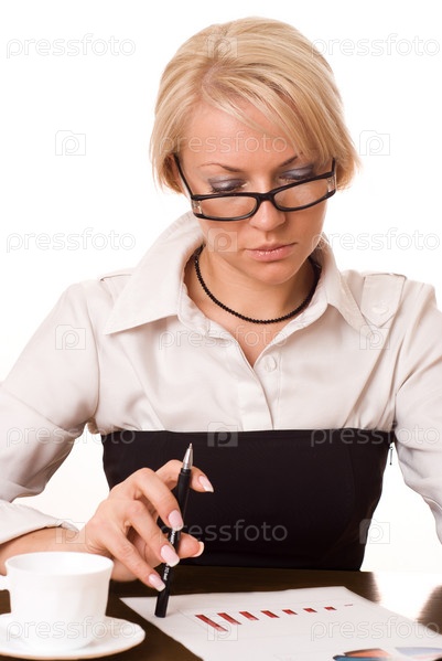 Деловая женщина работает, белый фон