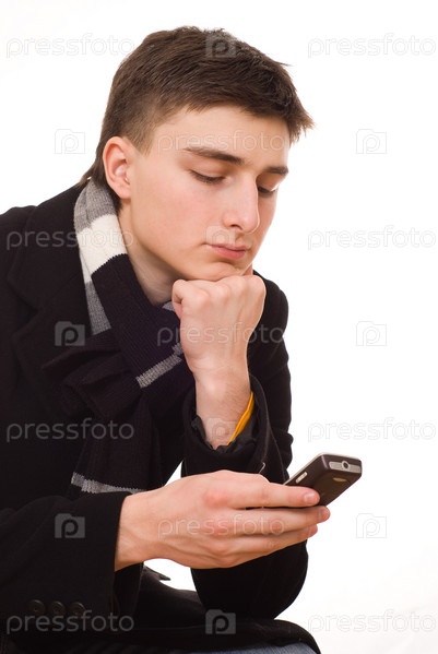 Красивый человек в пальто с мобильным телефоном на белом фоне