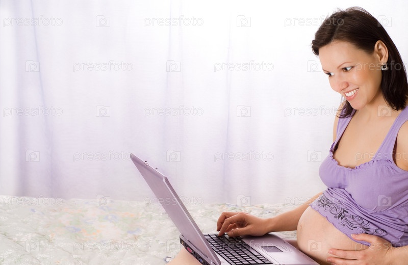 Беременная женщина с ноутбуком на кровати фоне