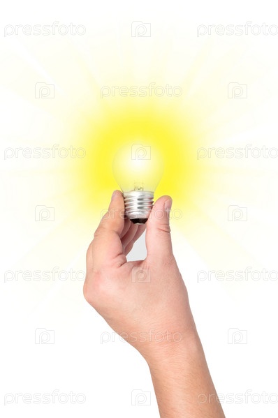 Яркая лампочка в руке на белом фоне