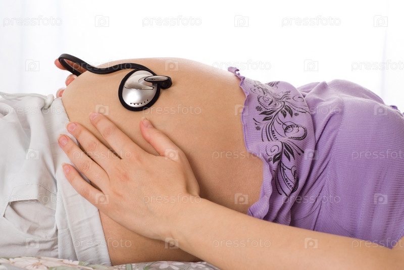 Беременная женщина с наушниками на животе лежит в кровати