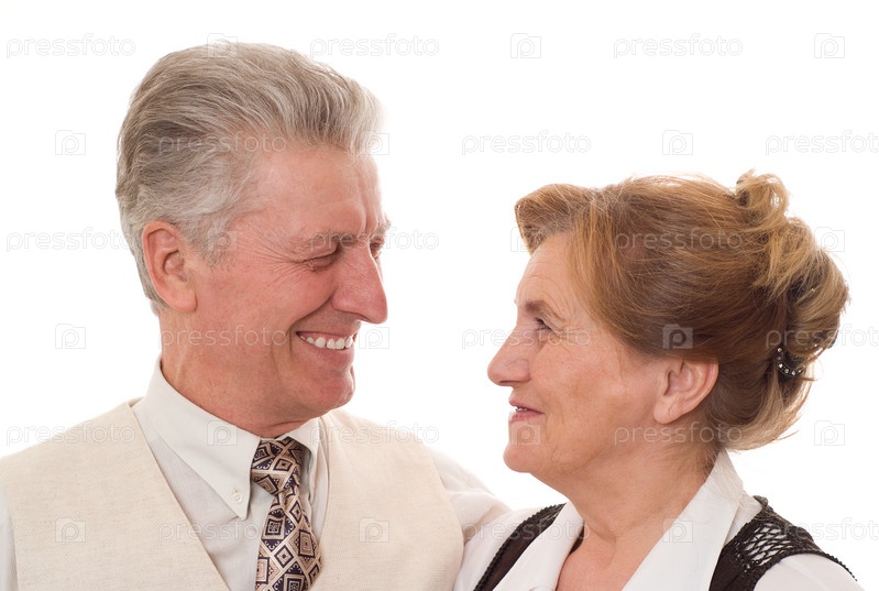 Пожилые мужчина и женщина с улыбкой смотрят друг на друга