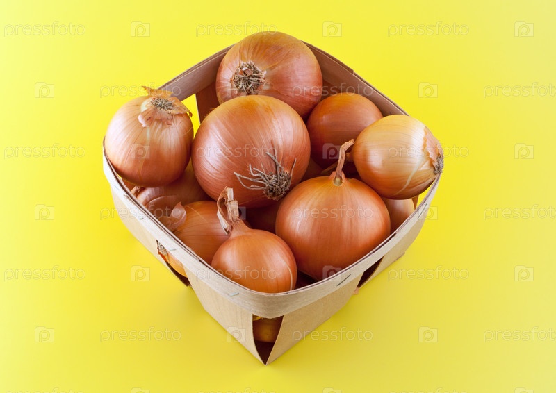 Контейнер с луком на желтом фоне