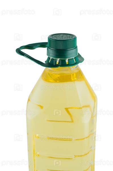 Масло в пластиковой бутылке на белом фоне