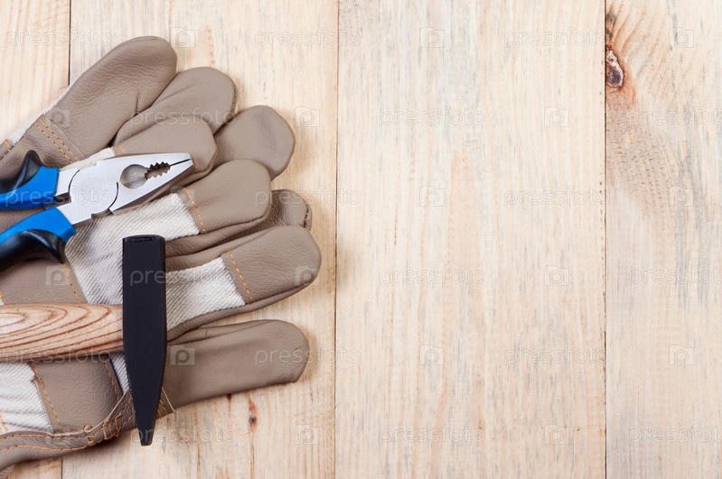 Молоток, перчатки и плоскогубцы на деревянной поверхности