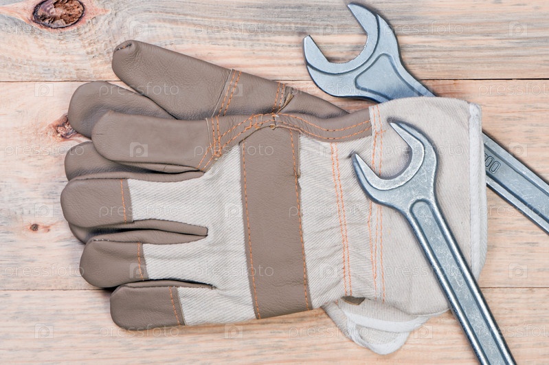 Перчатки и гаечные ключи на деревянной поверхности