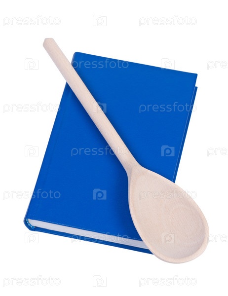 Книга и деревянная ложка на белом фоне