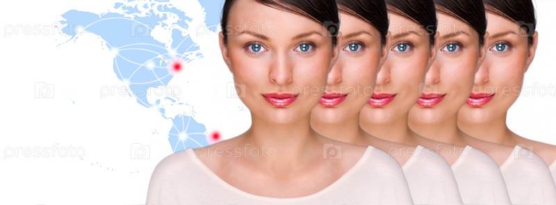 Клоны деловой женщины на фоне карты мира