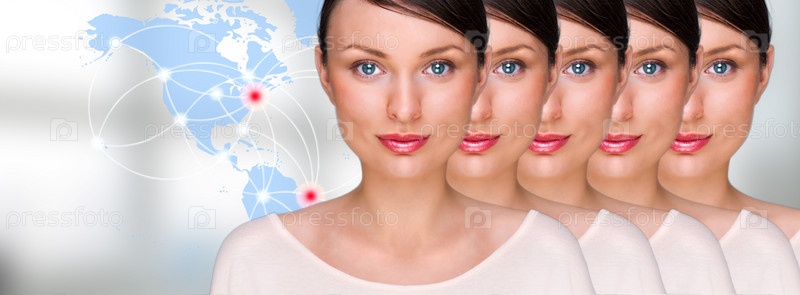 Клоны деловой женщины на фоне карты мира