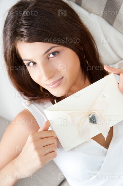 Портрет красивой девушки с поздравительной открыткой
