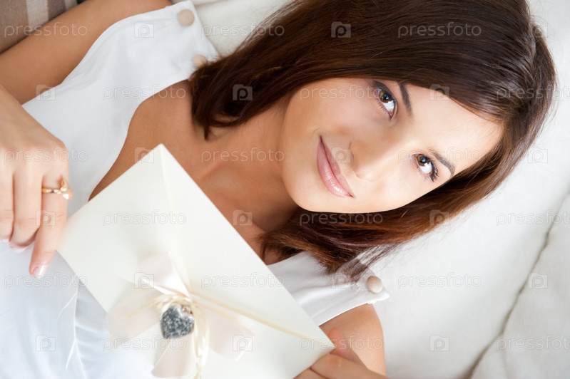 Портрет красивой девушки с поздравительной открыткой