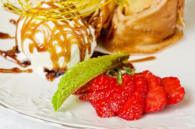 Десерт из блинчика с бананом, мороженого с карамелью, клубники и мяты