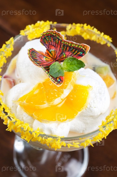 Десерт из мороженого с киви и апельсином, украшенный бабочкой